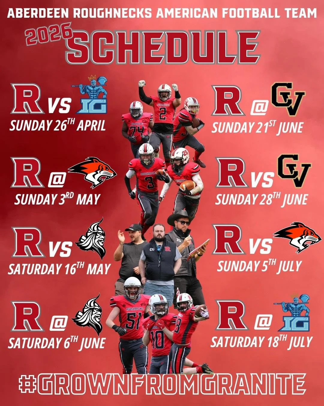 26/04 - Inverclyde Goliaths - Home 〰️ 03/05 - Glasgow Tigers - Away 〰️ 23/05 - Newcastle Vikings - Home 〰️ 06/06 - Newcastle Vikings - Home 〰️ 21/06 - Clyde Valley Blackhawks - Away 〰️ 28/06 - Clyde Valley Blackhawks - Home 〰️ 05/07 - Glasgow Tigers - Home 〰️ 18/07 - Inverclyde Goliaths - Away
